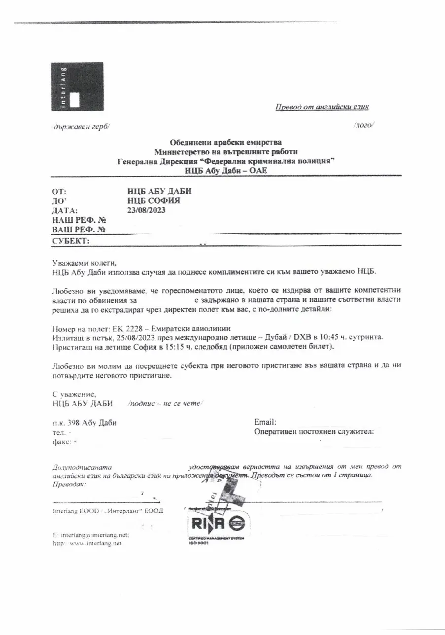 1 – Писмо от Министерство на вътрешните работи на ОАЕ на английски език от дата 23.08.2023 г.;
