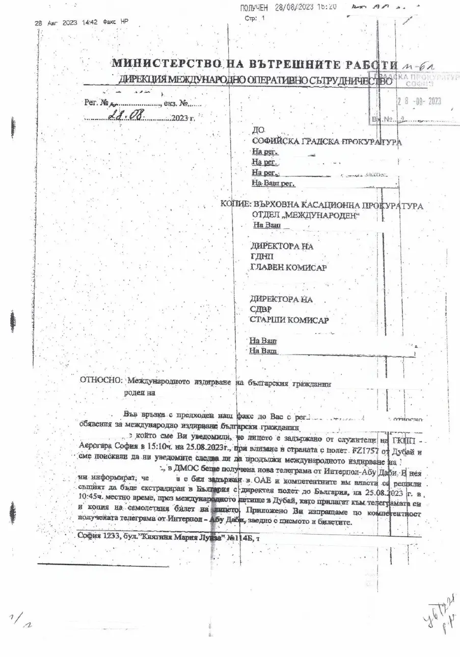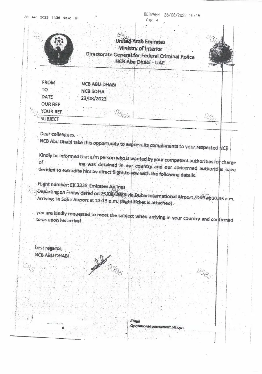 В документите е посочено, че компетентните власти на ОАЕ са решили да екстрадират българския гражданин с директен полет от Дубай до София. Допълнително е посочено, че полетът е на 25 август, като самолетът каца на летището в София в 15:15 часа.